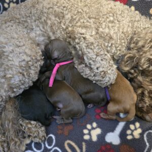 Sahara is about to jump start her career with Jose` this fall. These two small mini's will be such a cute couple and give us some of our smaller micro-mini's. Sahara is our daughter of Lindy my personal lap doodle and Jose` from our Kinder another sweet and well loved micro mini red. Sahara and Jose` have blessed us with a litter of 4 - there are 3 girls - Red - Firebird, Brown - Fiat and Black - Fiesta. 1 lone Brown boy - Ferrari. This litter is fully reserved.